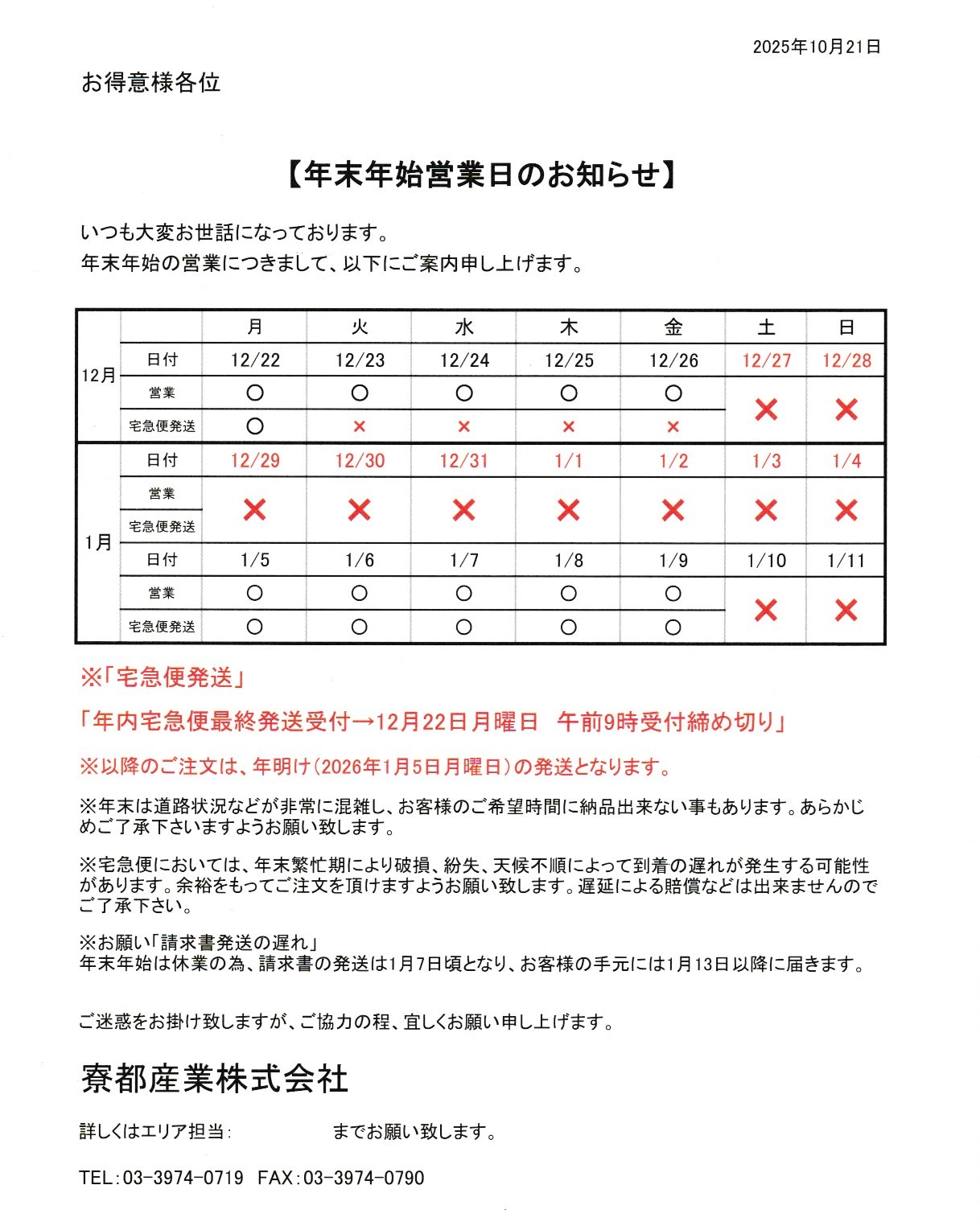 2025年年末~2026年年始休業のお知らせになります。